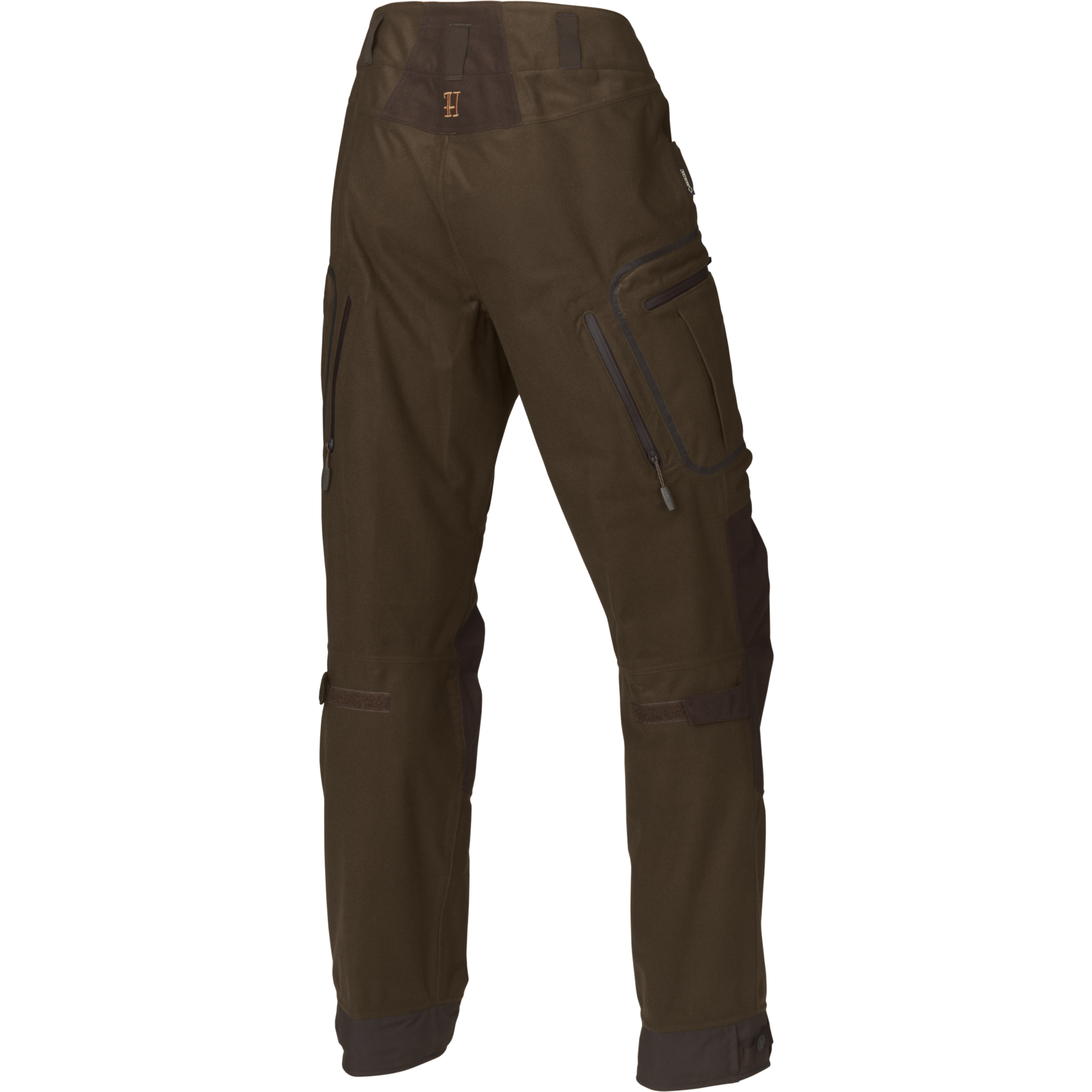 Förutom två fickor fram har Mountain Hunter-byxorna två benfickor med vattentäta dragkedjor och en patronhållare i höger benficka. Dessutom har byxorna justeringsremmar i nylon i bensluten och justeringsremmar bakom knäna. Därmed kan du lätt skapa mer utrymme runt knät, vilket är praktiskt när du jagar på fjället och vill ha stor rörelsefrihet. På vänster sida av linningen har byxorna en D-ring för att fäste av olika slags utrustning, och på baksidan av låren sitter meshfodrade ventilationsöppningar med vattentäta dragkedjor.