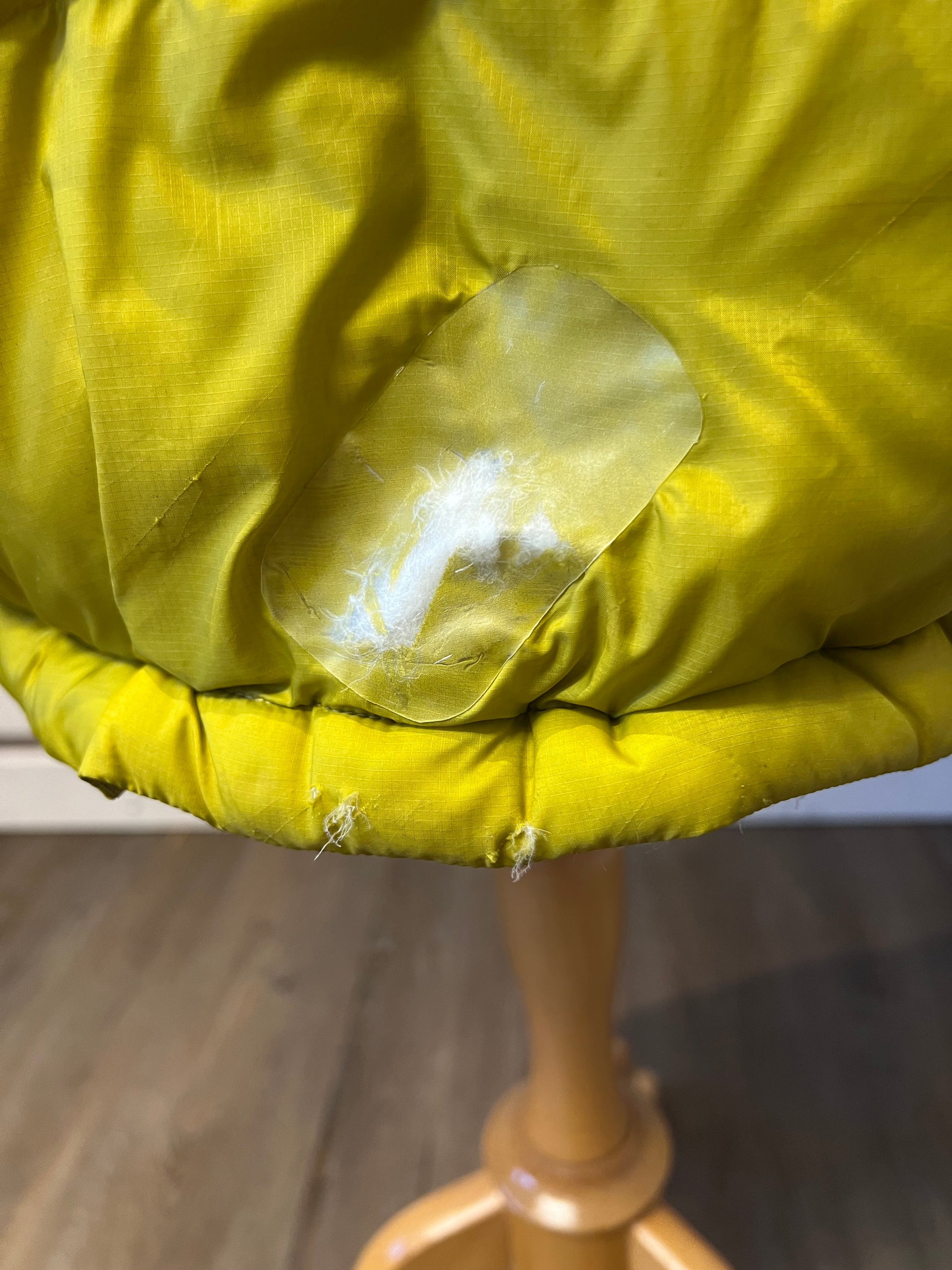 Mediumstor reva längst ner på rygg samt några små hål revan är tejpad med lagningslapp (se bild)